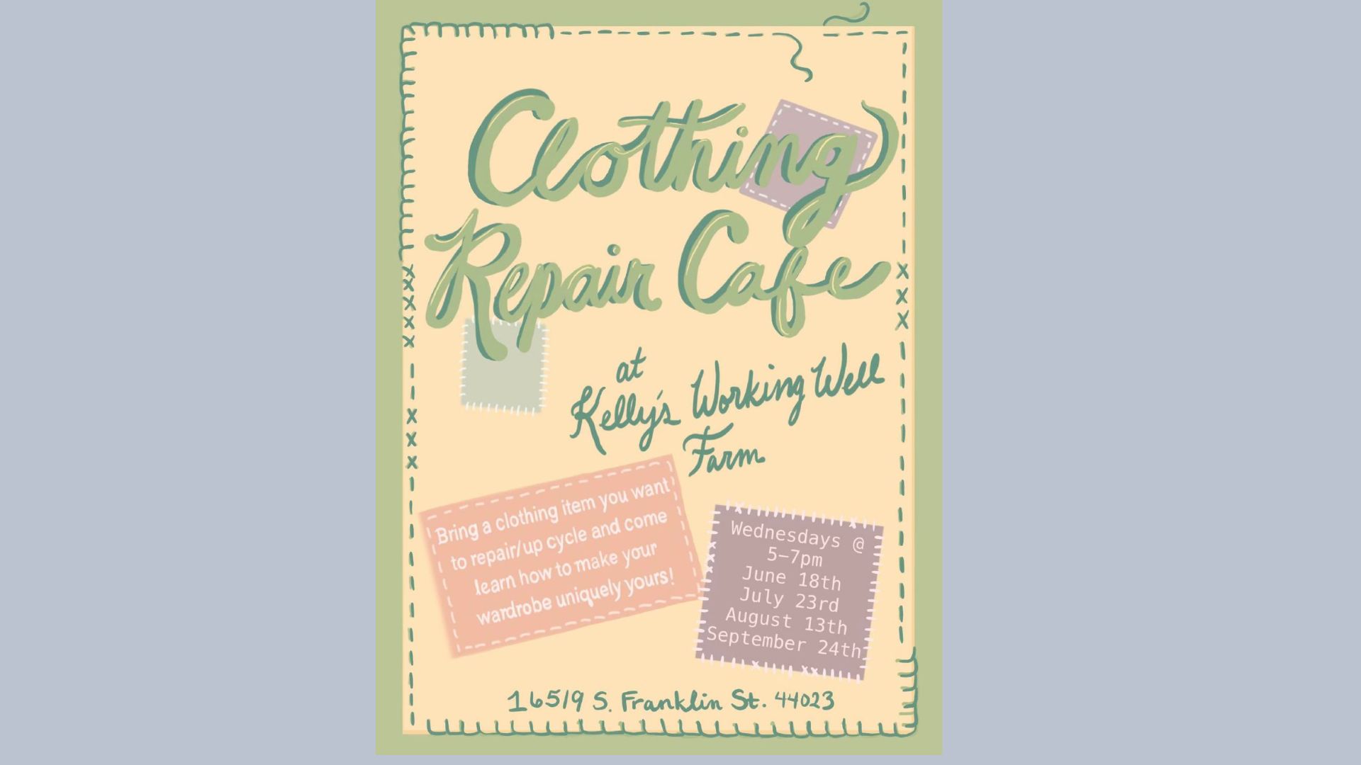 Lost a button? Broken zipper? Want to make simple alterations to your clothing or creatively mend holes? Join us once a month starting June 18th 5-7pm at Kelly’s Working Well Farm. Bring a clothing item to repair or upcycle and enjoy customizing your wardrobe. There will be KWWF jam to sample along with tea and fizzy drinks made with herbs and fruit from the farm.