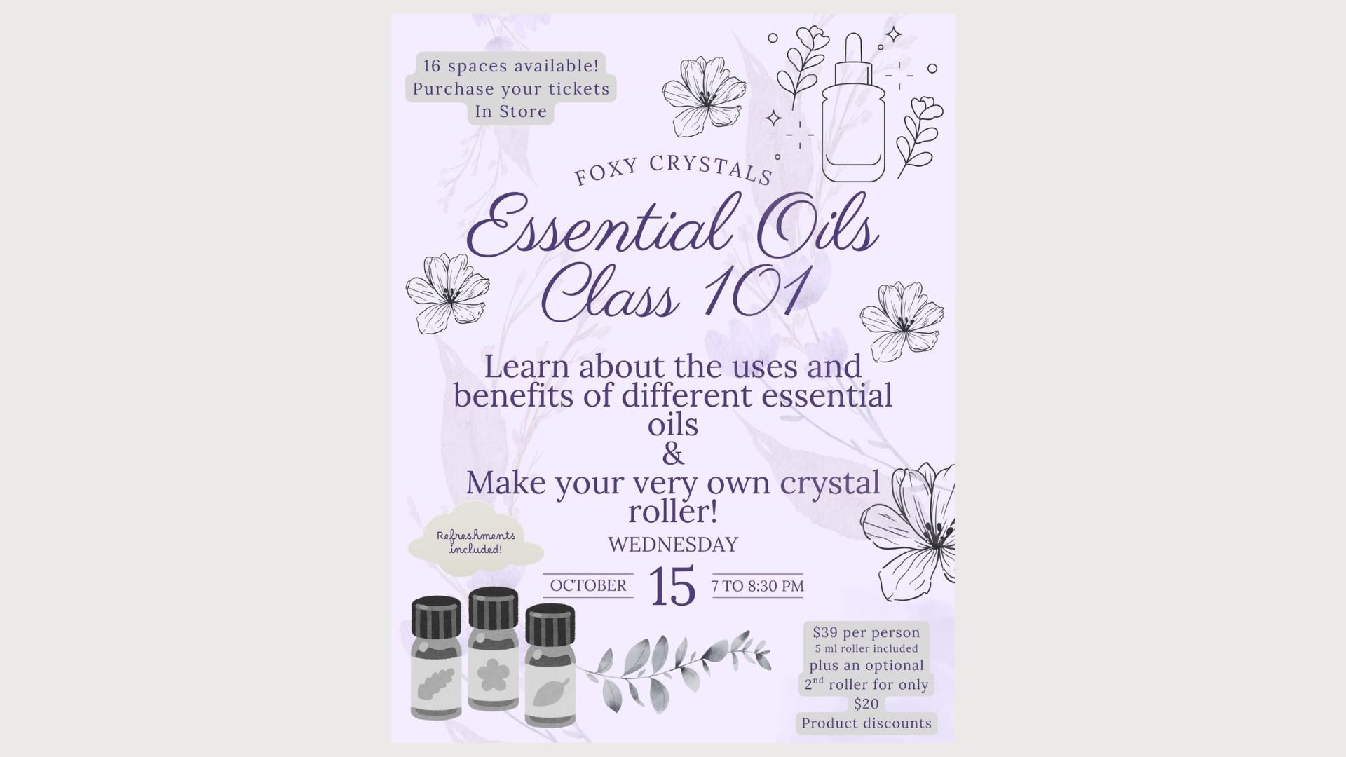 Foxy Crystals at 24 N Main Street is hosting an Essential Oils class. Learn how using essential oils can improve your day to day life.