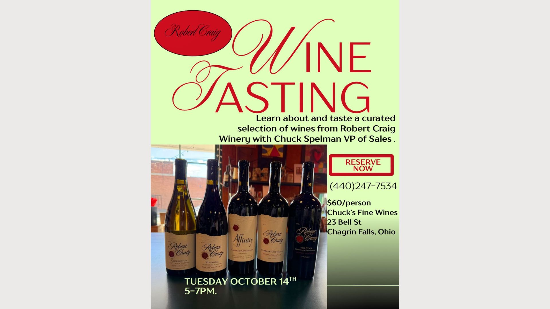 Join us this Tuesday October 14th from 5-7pm for a tasting with Chuck Spelman VP of Sales for Robert Craig Winery!!! An excellent selection of beautiful wines and great company!!