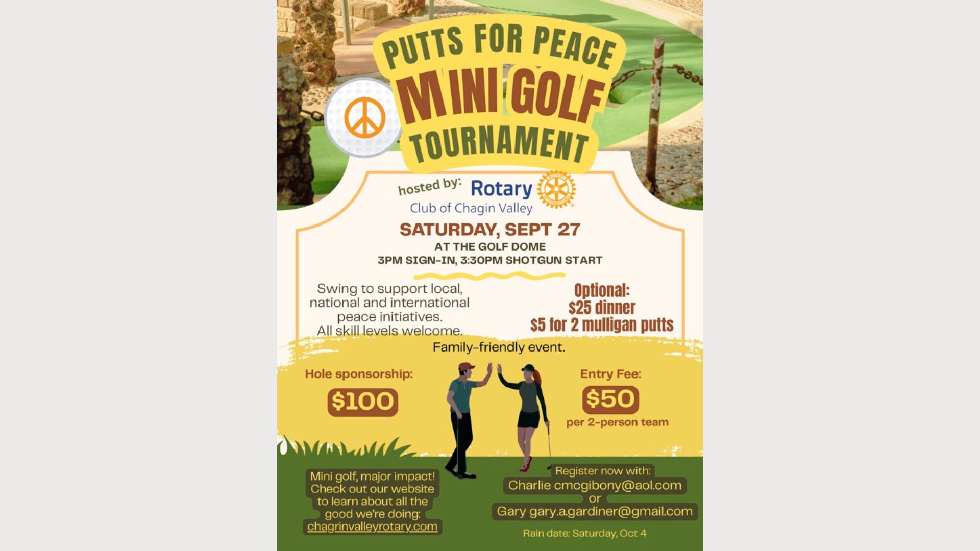 Hosted by Rotary Club of Chagrin Valley Saturday, September 27 2025 Golf Dome 3 PM Sign in 3:30 PM Shotgun Start $50 entry fee per 2 person team Optional $25 dinner $5 for two mulligan putts   Swing to support local, national and international peace initiatives.  All skill levels welcome. Family friendly event.
